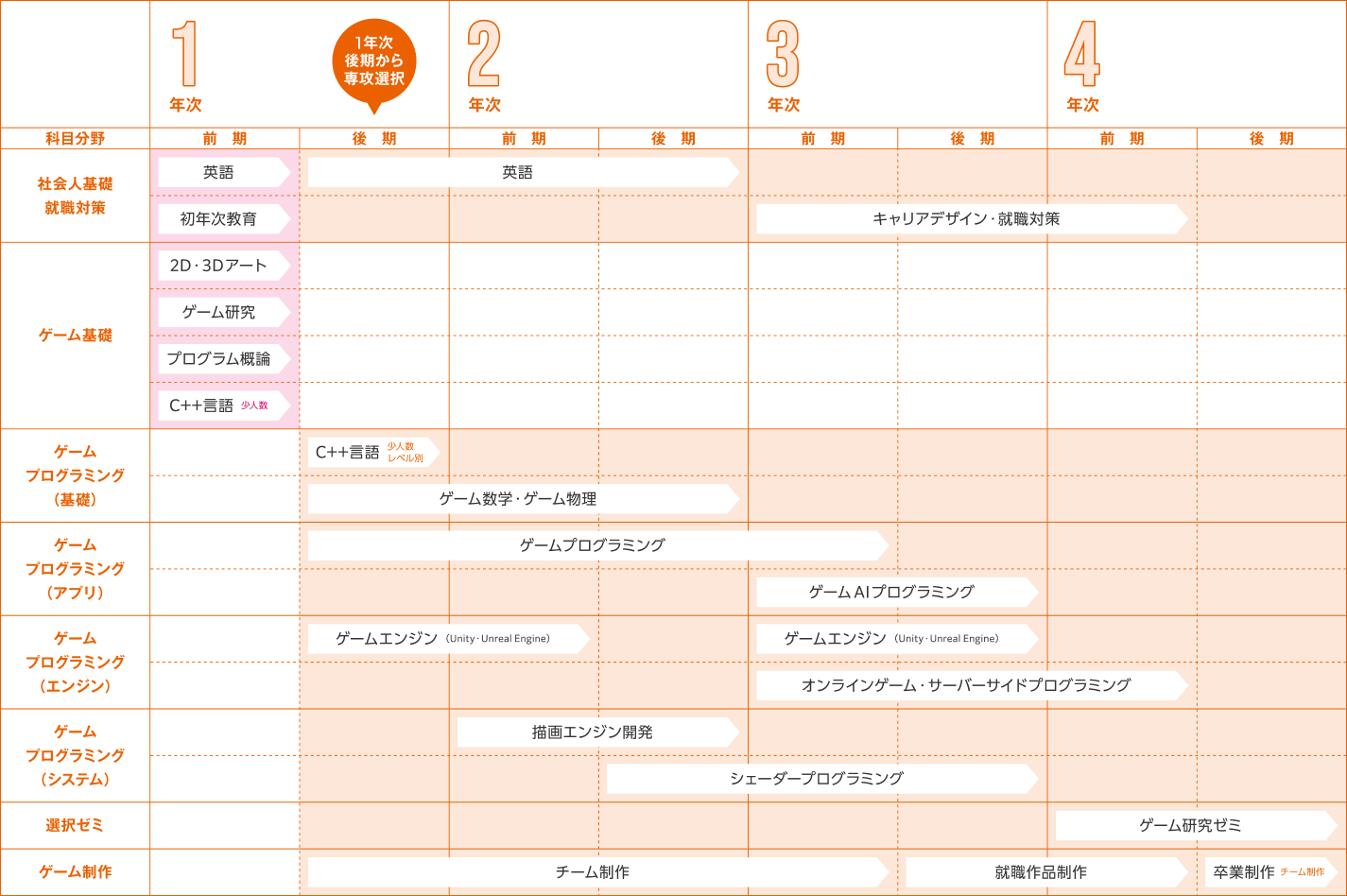 例:ゲーム開発エキスパートコース(4年制)ゲームプログラム専攻 1年次後期