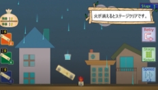 降り続く雨とバケツにたまった水を使って火を消す物理アクションゲーム。火元とバケツの位置を見極めて、適切な位置にアイテムを配置することが攻略ポイントです。