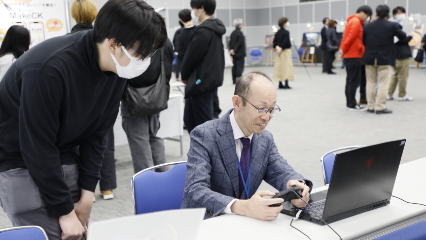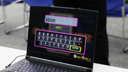小椋くん自ら来場者の方にアドバイスをする場面も!実際に試遊した方からは、「おもしろいね!」「全部自分で作ったの?すごいね!」という声が飛び交っていました。そんな中おもむろに現れたのは…!なんと校長先生!小椋くんから基本操作や高得点を出すコツを聞きながら楽しくプレイする姿をパシャリ!小椋くんこだわりのランキング機能にも、『KOCHO』の名がしっかりと刻まれました!1日目にしてブースに人だかりができるなど、「LAUNDRY」のおもしろさが証明された2日間となりました…!