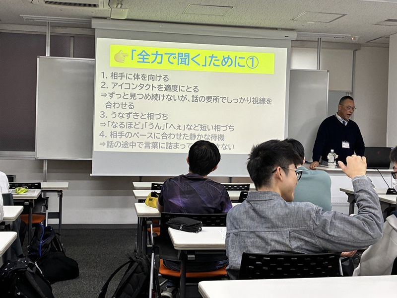 今回は、相手の気持ちを想像して、「全力で聞く」ということについて、実践を交えて学びました。