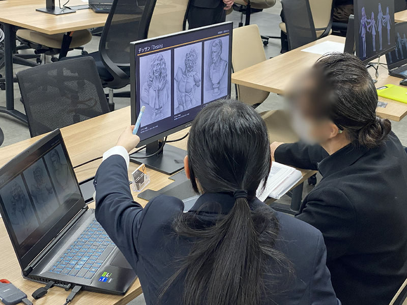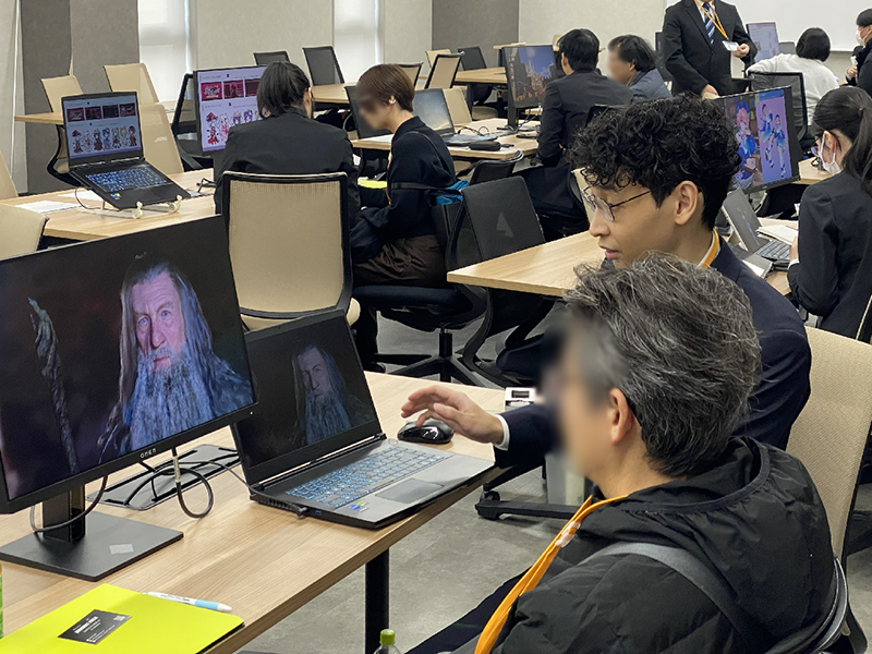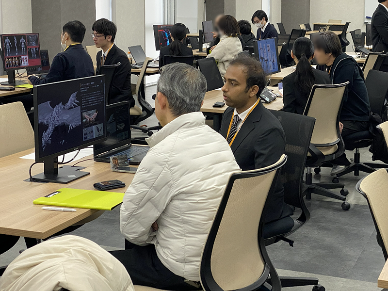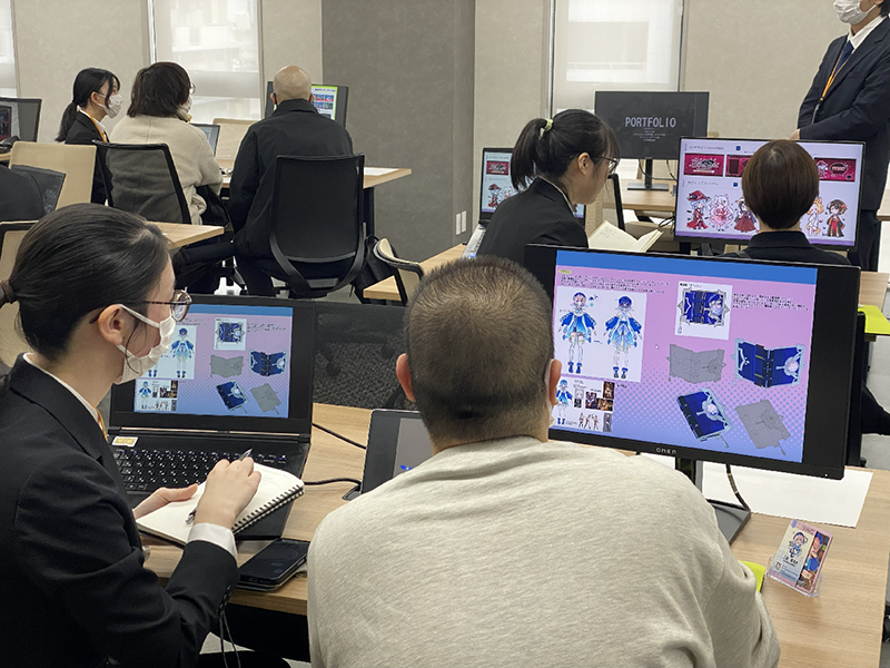 CG分野の学生たちはこれまで制作してきた作品を企業様に向けて猛アピールします!褒められて喜ぶ学生、厳しい意見と向き合ってしっかりメモを残す学生、名刺をもらう学生、ポーズの指導を受けながら企業様と同じポーズを取って体に記憶させている学生など、朝から夕方まで絶え間なく非常に盛り上がりを見せてました。