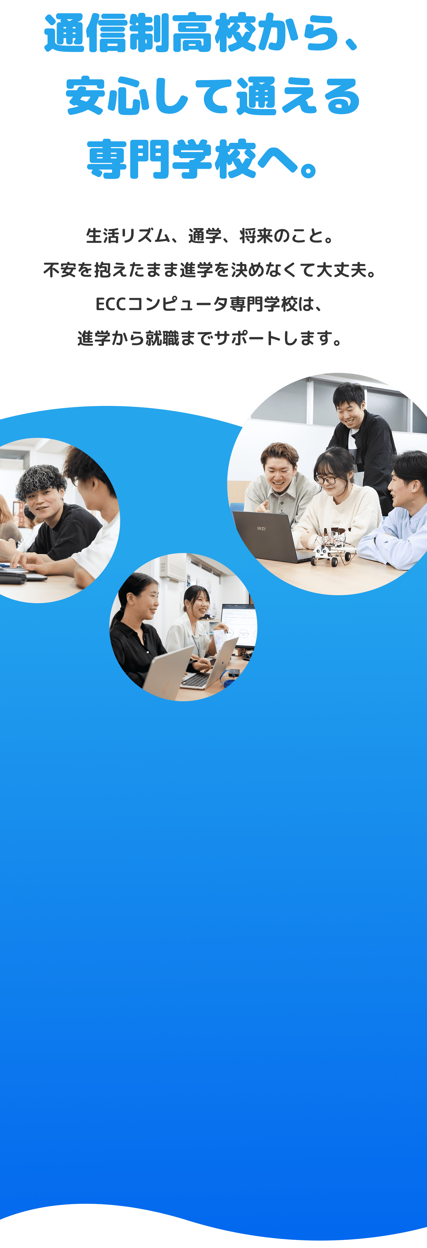 ECCコンピュータ専門学校は、一人ひとりのペースを無視することはありません。自分らしく学んで、あこがれのゲーム・IT業界へ進めます。 ECCコンピュータ専門学校は、一人ひとりのペースを無視することはありません。自分らしく学んで、あこがれのゲーム・IT業界へ進めます。