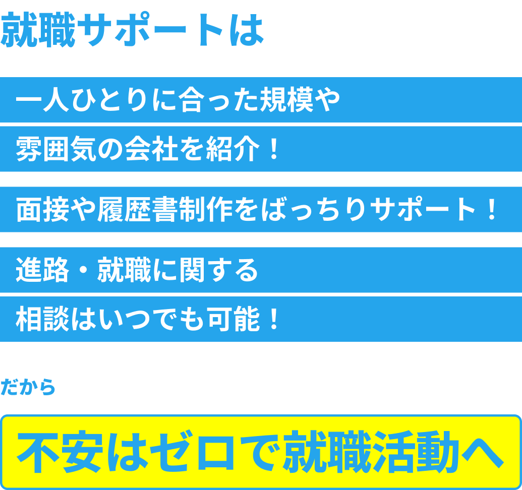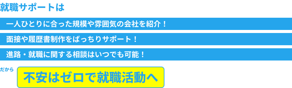 ベストな就職先へ導く!全国の企業とパイプを持つキャリアセンターの先生が、一人ひとりに合った規模や雰囲気の会社を紹介。求人検索コーナーや資料コーナーでは、リアルタイムの求人情報を自由にチェックできます。