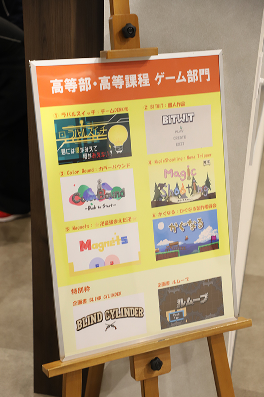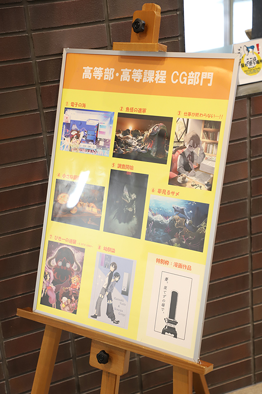 高等課程からはゲーム6作品、CG8作品、特別展示3作品(企画書・漫画)を展示しました。