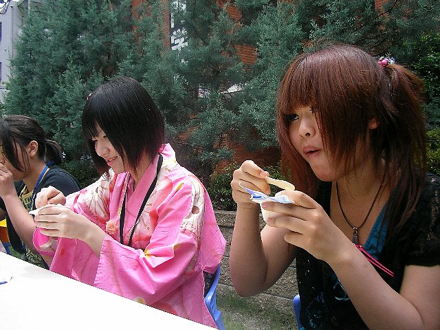 また早食い競争は男子の「ざるそば」からスタート。6人が一斉に「ざるそば」を口の中へ。中には箸を使わず手で食べる姿も…。女子は冷た~い「アイスクリーム」。一斉に食べ始めましたが、韓国からの留学生が断トツの優勝!ペロリと食べてしまいました。男女各優勝者には「お菓子の詰合せ」が学生会から贈られました。