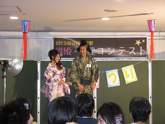 夕方からは「ECC3校交流 織姫・彦星コンテスト」が開催されました。このコンテストは3校の学生有志による「3校イベント実行委員会」の企画によるもので、男子8名・女子9名・計17名のエントリーがあり、3校の個性あるパフォーマンスが繰り広げられました。見事グランプに輝いたのは、彦星が国際外語専門学校(大編コース)の学生、織姫はアーティスト専門学校(モデル・タレントコース)の学生がそれぞれ獲得しました。審査員をして頂いた各校の先生方や観客の学生も楽しいひと時を過ごすことができました。