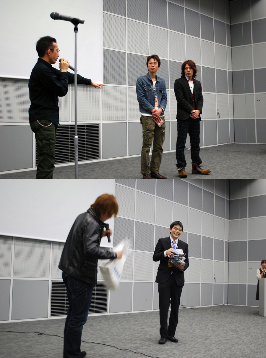 オーディエンスは会場いっぱいに着席した学生、審査員はゲーム会社から現役クリエイターの方々!!! このシチュエーションで緊張するなという方が無理な話ですね。