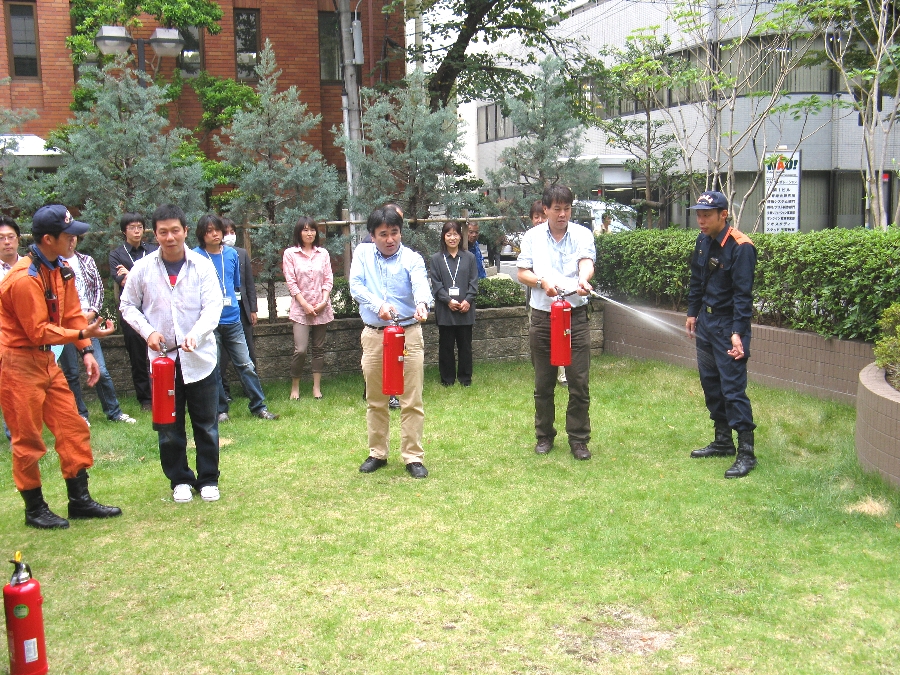 その後、大阪市北消防署(〒530-0013 大阪市北区茶屋町19番41号)の署員から消火器の取り扱い説明を受け、実際に教職員による「消火器取り扱い訓練」を実施しました。