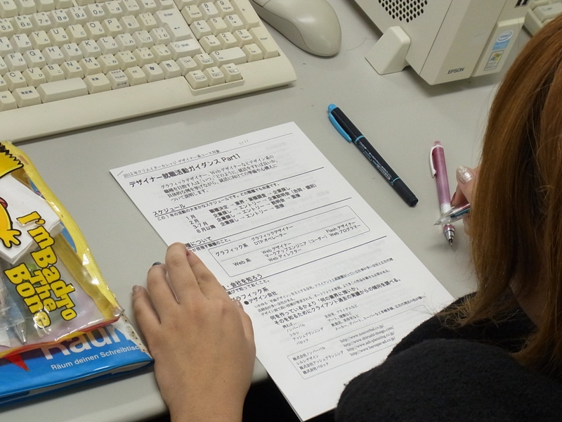 ガイダンスはデザイン会社など訪問して「どんな人材が必要か」「どんな作品が評価が高いか」など集めた情報を学生に伝えていきます。