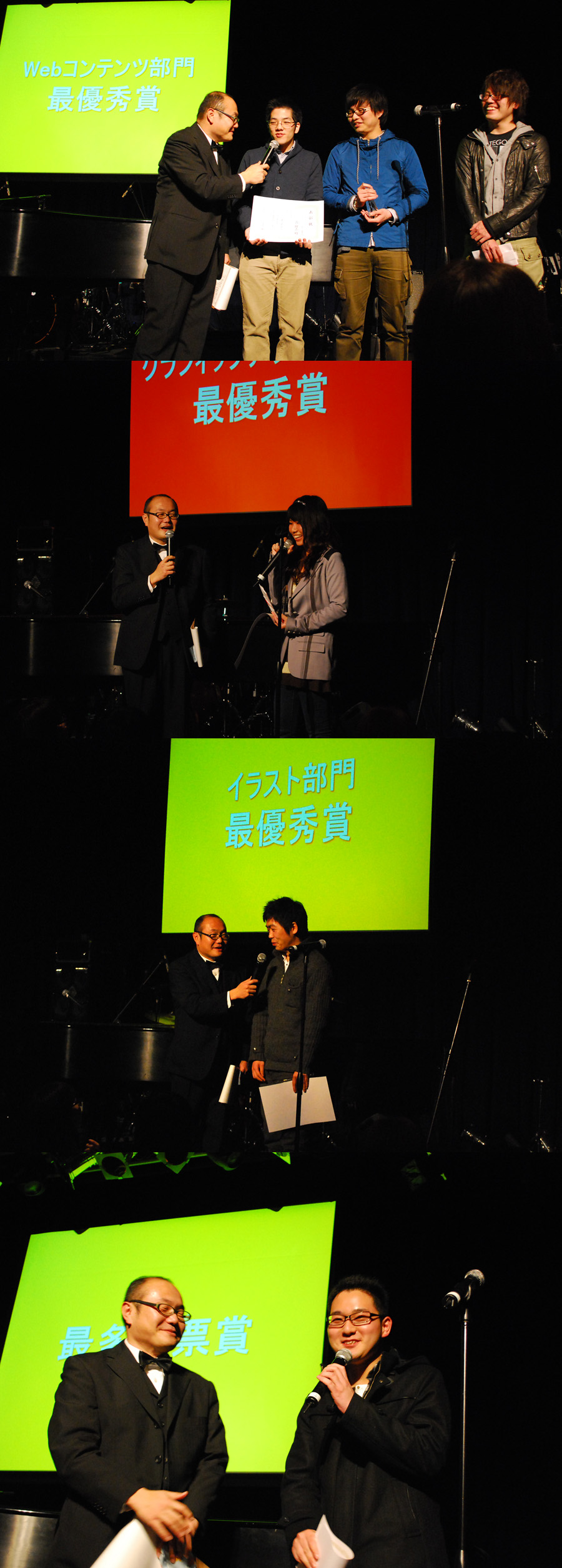各部門(グラフィックデザイン、Webコンテンツ、映像アニメーション、イラスト)のノミネート作品が発表され、作成した学生はステージでその思い入れやコンセプトをオーディエンスや審査員にプレゼンテーションします。