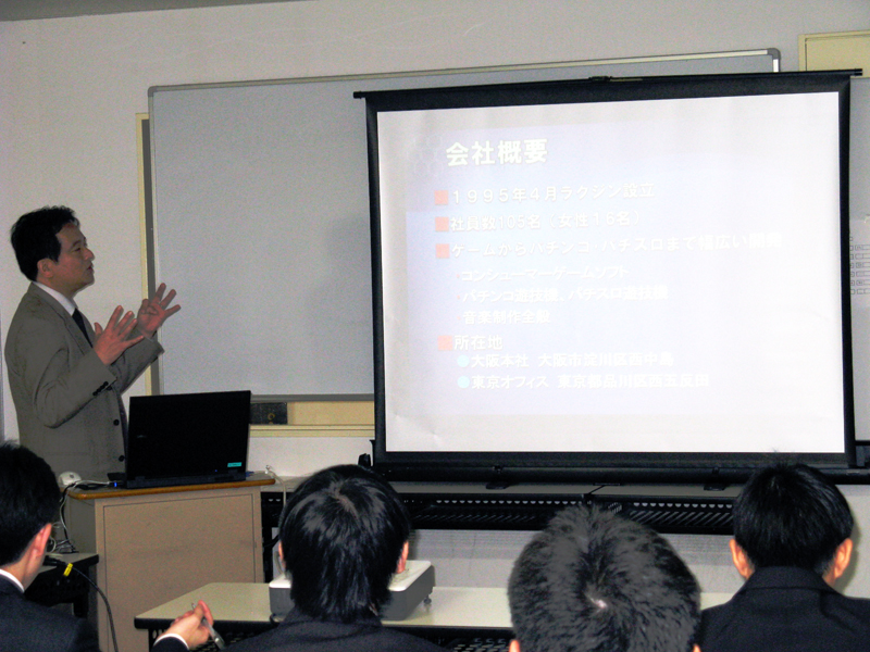大阪に本社を置く株式会社ラクジン。毎年早い時期にECCコンピュータ専門学校の学生を対象に「学内企業説明会」をして頂き、今回も人事採用の方からお話を頂戴しました。事業内容は、コンシューマゲームの企画・開発からパチンコ・パチスロ遊技機の企画・開発まで多彩な業務を展開。また、スタッフの親睦を深める為の社員研修旅行などの交流イベントも社内で実施しているとのこと。ECCコンピュータからは13名のECC就職活動生が参加。今後受験希望者は履歴書と作品提出の選考へと入っていきます。