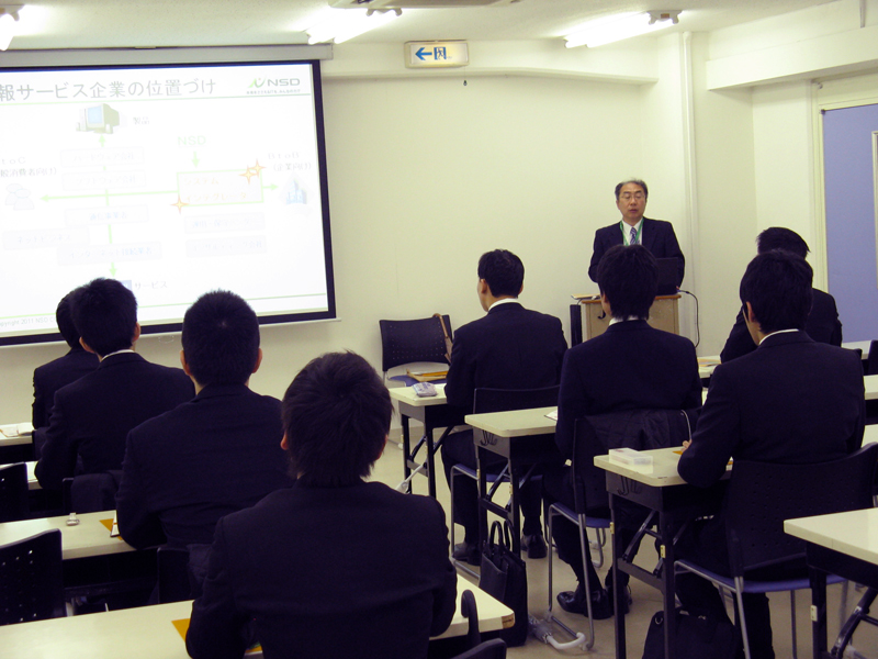 株式会社NSDは東京に本社を置く東証Ⅰ部上場企業。設立が昭和44年と歴史の長い企業です。毎年のように「ECC 学内企業説明会」を実施して頂いている会社で、過去ECC卒業生も多く採用いただいており、現在も30名近く働いています。今回は人事採用の方から最近のIT業界の動向を話して頂いたあと、自社の特徴をご説明頂きました。