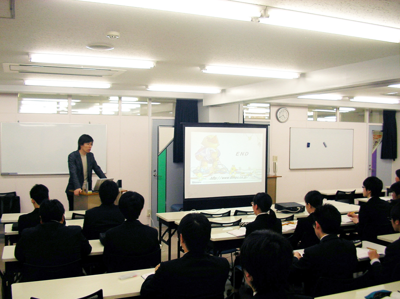本日は、株式会社ディンプスの総務課 課長 山下様に来校いただき、株式会社ディンプスの会社説明会を実施していただきました。まずは株式会社ディンプスが開発に関わった「STREET FIGHTER X 鉄拳」の映像で会社説明会がスタート。そして会社概要や沿革を、懐かしのゲームソフトや社長のエピソードなどを交えて楽しくわかりやすく説明してくれました。