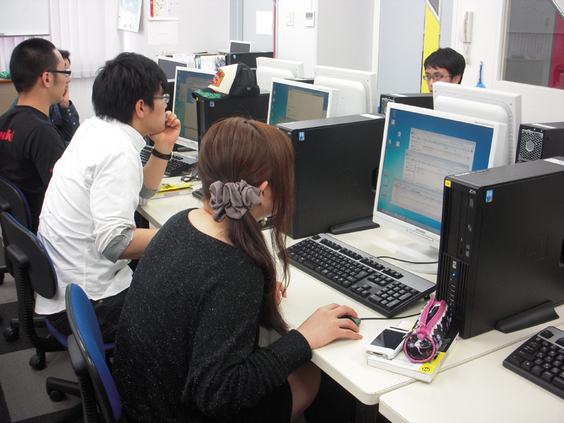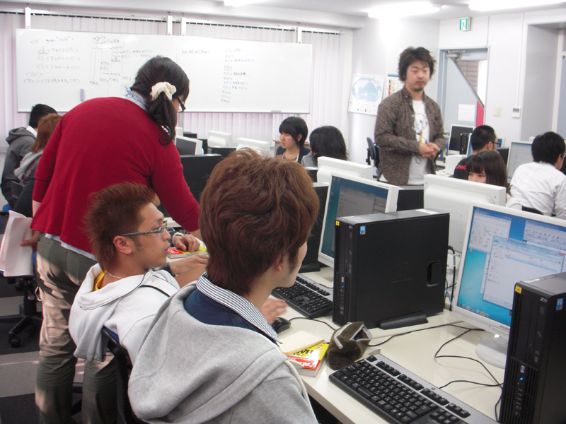 写真は、授業課題を皆で行なっているところですが、分からない所があると私達教員が常に巡回しながら学生達全員がしっかり理解出来るようにサポートしています。特に一年生の授業では、初心者の人も多いので特に注意しながら授業を進めるようにしています。