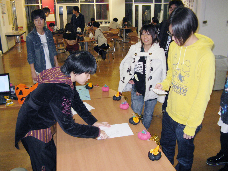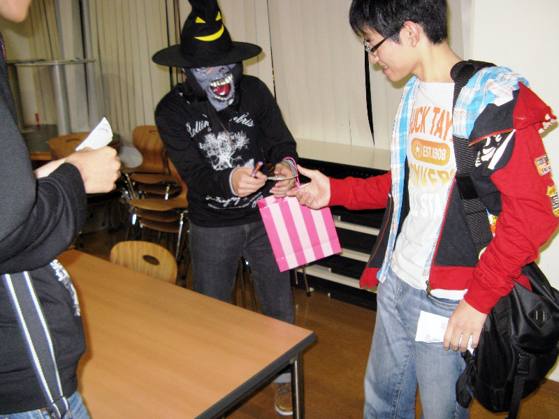 参加者は受付でカードを受け取ります。A~Dの4つの枠があります。校内のどこかに潜んでいる学生会メンバー20人が着ているコスプレの説明を受けます。「かぼちゃ人間」「おじいちゃんマスク」「クマのぷーさん」等々。コスプレ学生はA~Dグループに分かれます。そしてコスプレ学生を探しに校内を巡ります。見つけたら所属グループの枠にサインしてもらいます。スタンプでなくて…(笑)A~Dの枠が全部サインが埋まったらアガリです。受付けに戻って、お菓子がもらえる段取りです。