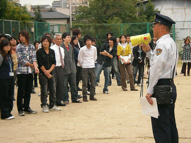 今年も放送設備を使った「通報訓練」、消火器と消火ホースを使った「消火訓練」、混乱や事故のない「避難誘導訓練」を行い、教職員と避難役学生を合わせた約120名が避難場所である「旧済美小学校」に避難しました。