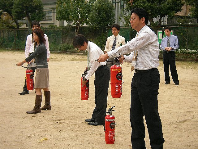 北消防署の署員から火災についてのお話があり、教職員も学生も熱心にお話を聞きました。その後、教職員で「消火器の取り扱い訓練」を実施し、「防災訓練」を終了しました。