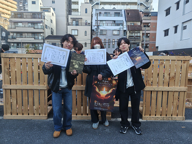 ECCコンピュータ専門学校がある、中崎町でのイベント「第15回キャンドルナイト」。毎年2月に開催されるこのイベントの告知用ポスターをWebデザインコースの1年生全員で制作し、地域の方々の厳選な審査の上、選んでいただいた3作品が表彰されました!